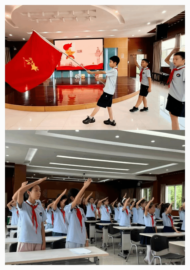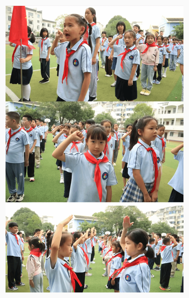 下午的分批入队仪式上,二年级新队员们身着整齐校服,在队旗前庄严宣誓。老队员为新队员佩戴红领巾,手把手教他们行队礼、唱队歌。“成为少先队员很光荣!” 新队员代表在发言中分享激动心情,稚嫩的话语里满是对未来的期待。仪式最后,全体队员共同呼号,用坚定的声音表达 “为共产主义事业而奋斗” 的决心。